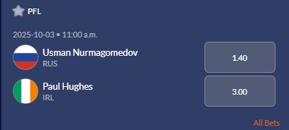 Here’s an example of how the fighter winner odds look on the Sports Interaction website using the Usman Nurmagomedov vs Paul Hughes fight from PFL Champions Series 3: Nurmagomedov vs Hughes 2.