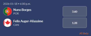 Felix Auger-Aliassime is a favourite in his opening match with Nuno Borges. You can select the players names to see the full list of betting lines available for the match. Auger-Aliassime is the 7th seed in the tournament and he has a good draw with none of Sinner, Alcaraz or Djokovic in his quarter. You can select the players names to see the full list of betting lines available for the match.