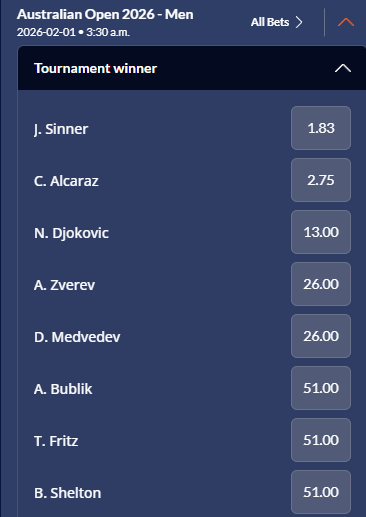 As you can see Jannik Sinner is a significant favourite to win the tournament for the third year in a row. Carlos Alcaraz is the second favourite, while Novak Djokovic is the third favourite to win his 11th Australian Open title.