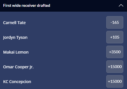 Carnell Tate, the Ohio State Buckeyes wide receiver, is expected to be the first wide received drafted. Jordyn Tyson is his main competition, while Makai Lemon also has an outside chance. I included the wide receivers with 150-1 or shorter odds at Sports Interaction in the above screenshot.