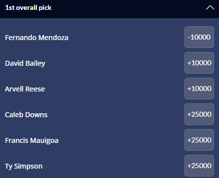 Fernando Mendoza, the star Indiana Hoosiers QB, is a lock to go with the first overall pick. David Bailey and Arvell Reese are the next closest according to the odds above with each player having 100-1 odds of going first overall.